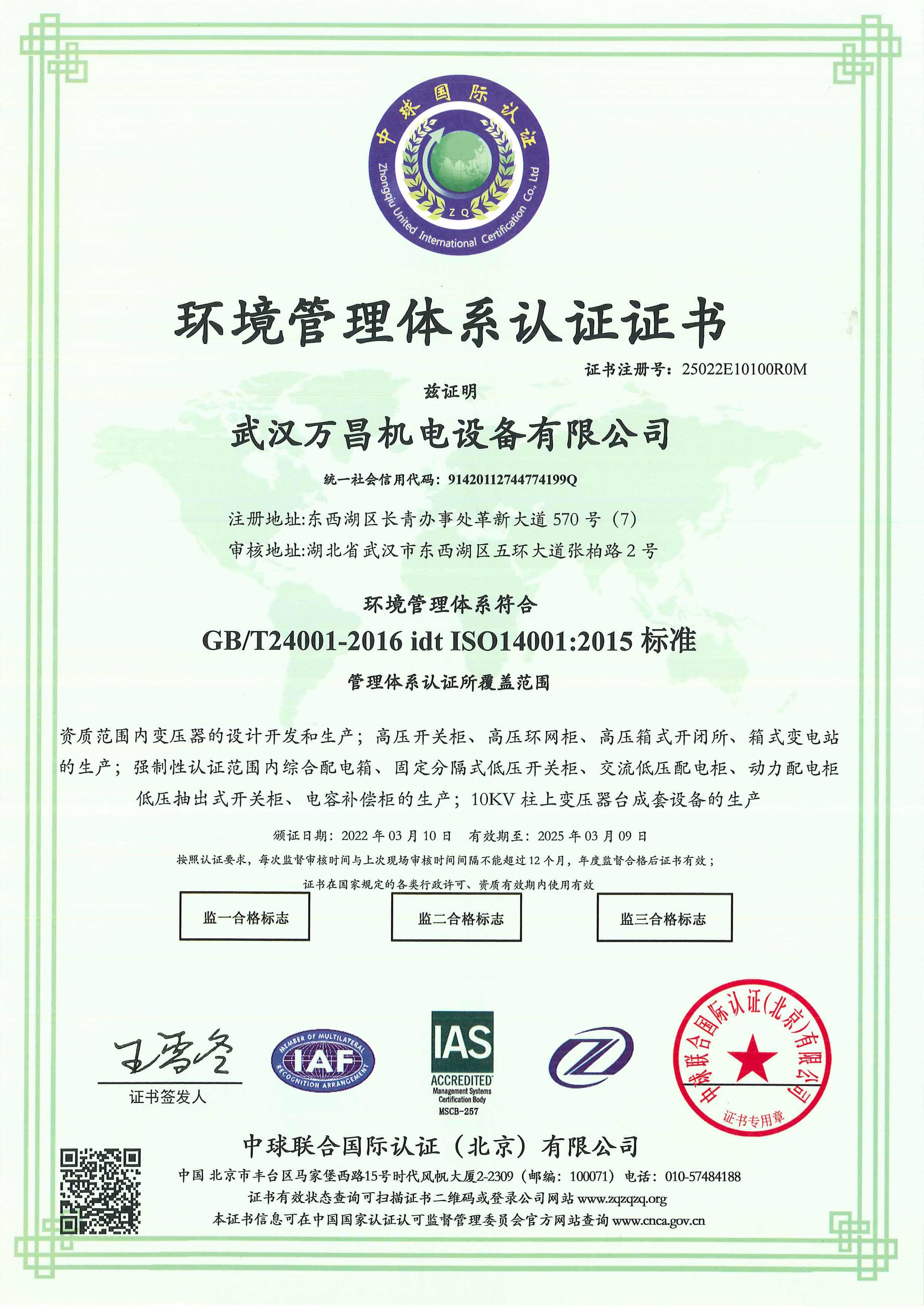 環(huán)境管理體系認證證書